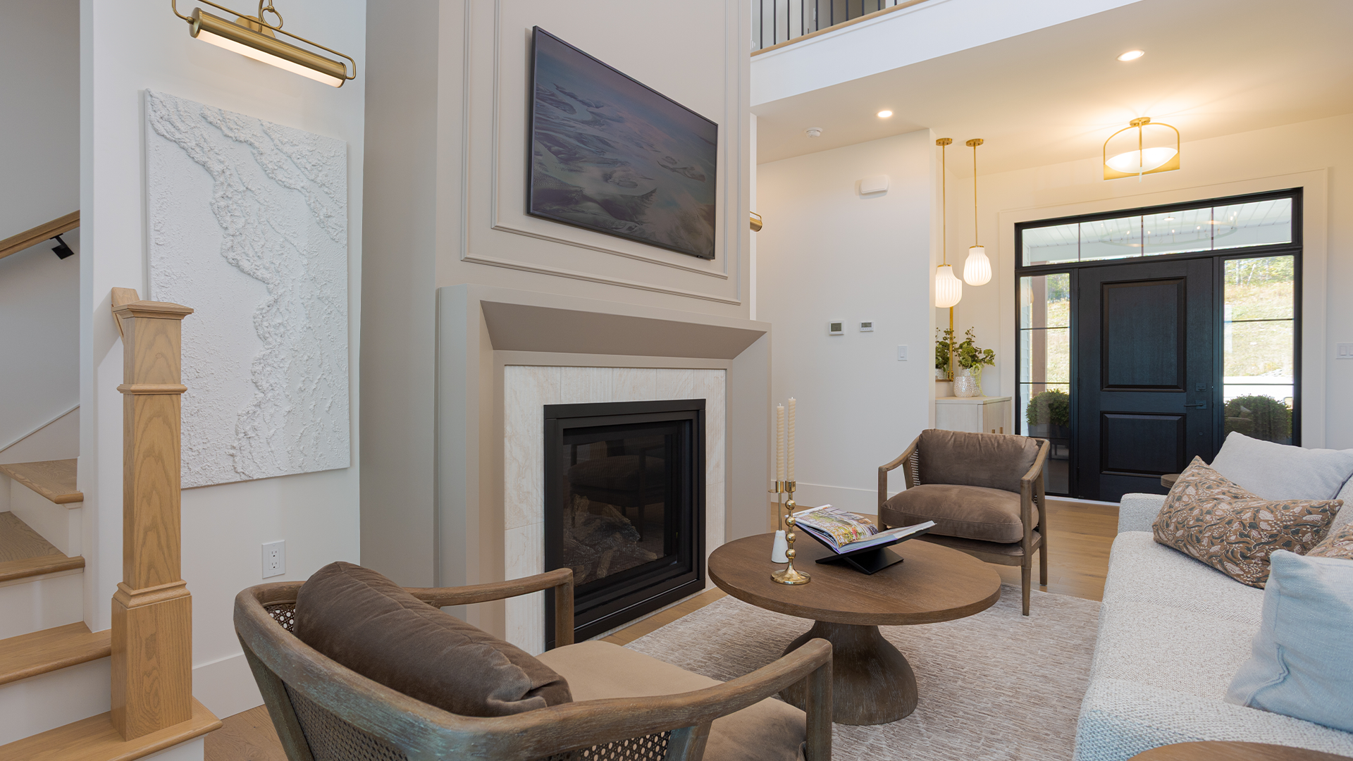 features a master suite with a spa-inspired bathroom and a private balcony. Nineteen-foot ceilings and a custom fireplace enhance the main living area, while the gourmet kitchen and butler's pantry are perfect for entertaining.